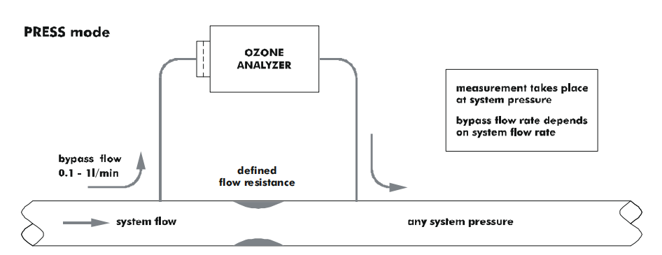 將分析儀連接到臭氧系統的兩種模式,全流式和旁通式,當然都需要配備有耐臭氧的內部壓力傳感器的分析儀。壓力傳感器的壓力范圍和由內部微處理器執行的壓力補償范圍必須與臭氧系統中實際可能出現的壓力范圍相匹配。我們提供的壓力范圍為 0.5-1.5 至 0.5-4.0 bar 絕對壓力。