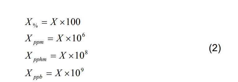 這通常是一個非常小的數字,因此混合比通常以百分比、百萬分之幾、億分之幾或十億分之幾(全部按體積,而不是質量)表示,如下所示: