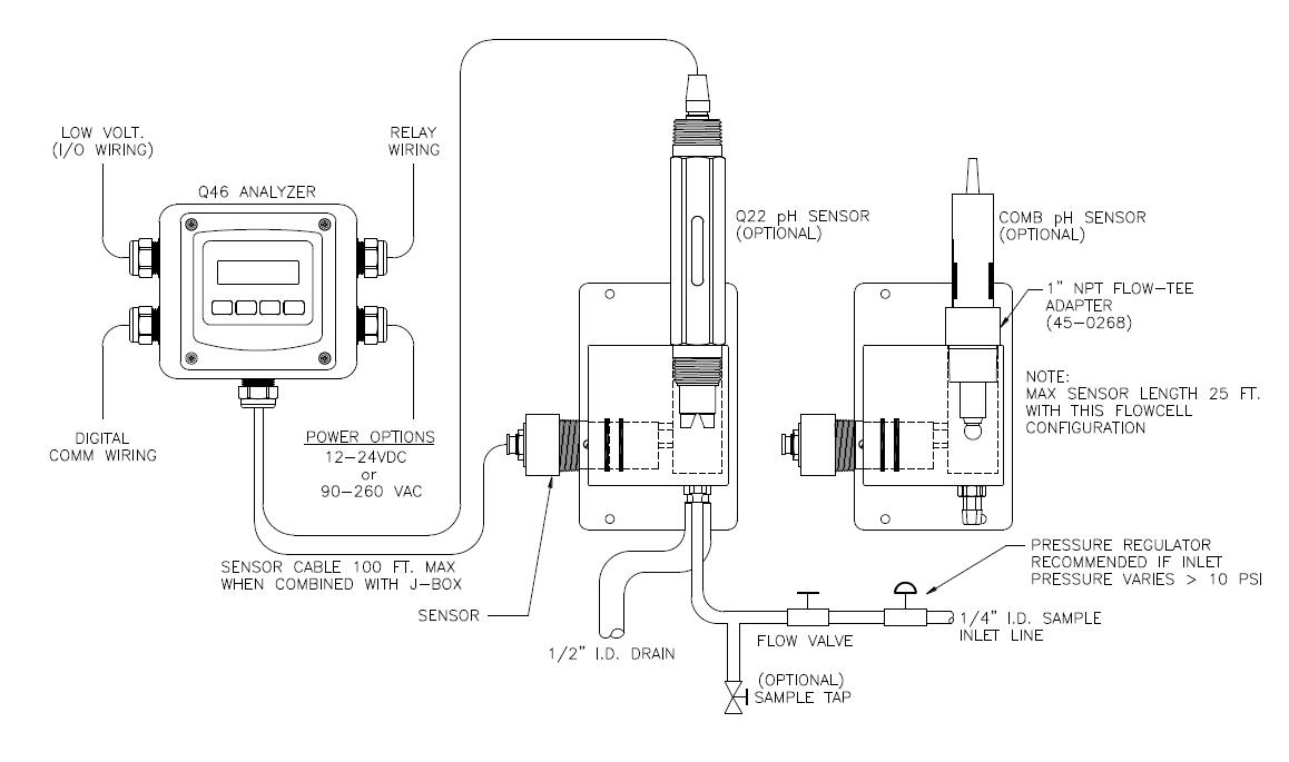 標準型號 Q46H/64 系統(tǒng)包括三個主要組件:Q46H 分析儀、恒壓頭流通池和臭氧傳感器。密封流通池也可用于可以仔細控制樣品流速和壓力的應用。圖 1 顯示了一個典型的安裝。